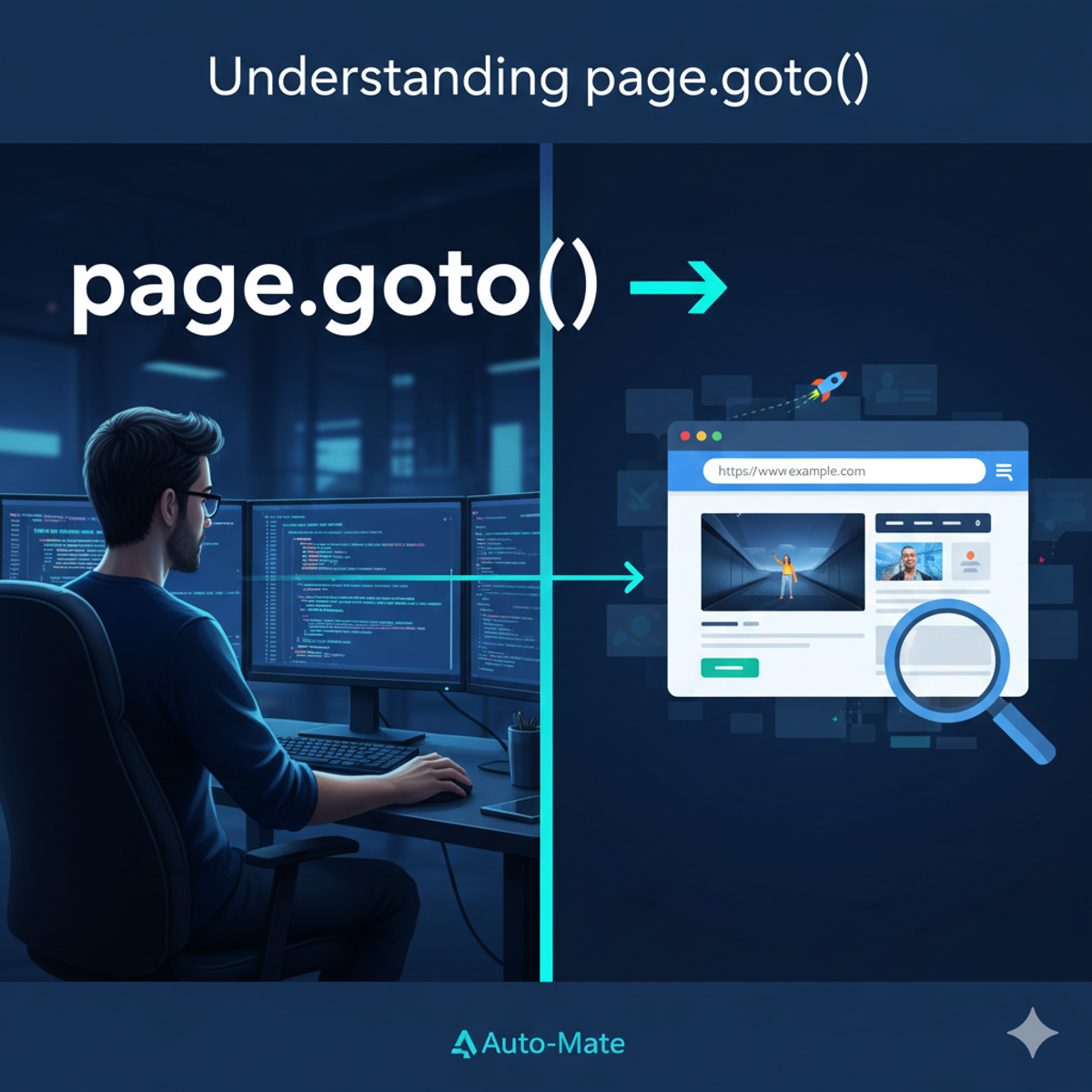 `page.goto()` tells the browser to load a URL—like asking a friend to drive somewhere, delays may occur from traffic or network issues.